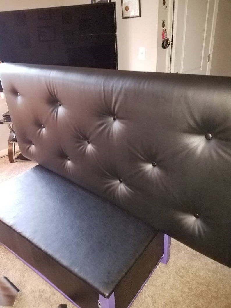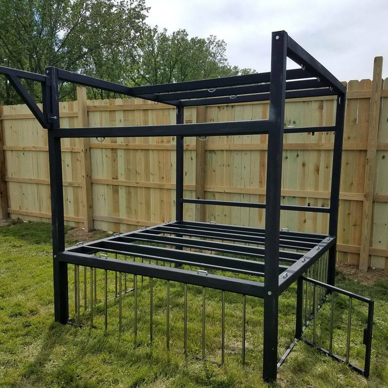This is our king size bed frame with a 2 ft. cage under mattress with padded leather floor. The base has several support beams so you don't need that old box spring. The Things you can do with thing is only limited to your imagination. This design featured is not the standard frame. This was altered to fit a clients accommodations. Contact us to get started on designing your dream bed t hat will last you forever. Take your fetish for bondage( chains or rope) to the next level. All extra add on will be charged accordingly.