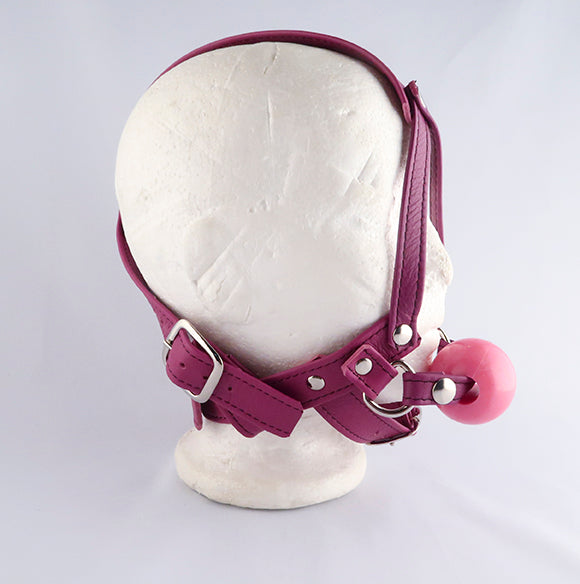 Our new Playdate Ball gag Harness is bondage bliss. Soft comfortable luxurious garment leather crown neck and chin straps hug your head. A snap out 5/8" leather strap holds a silicone ball gag securely. Fastens with sturdy 1" low profile buckles.